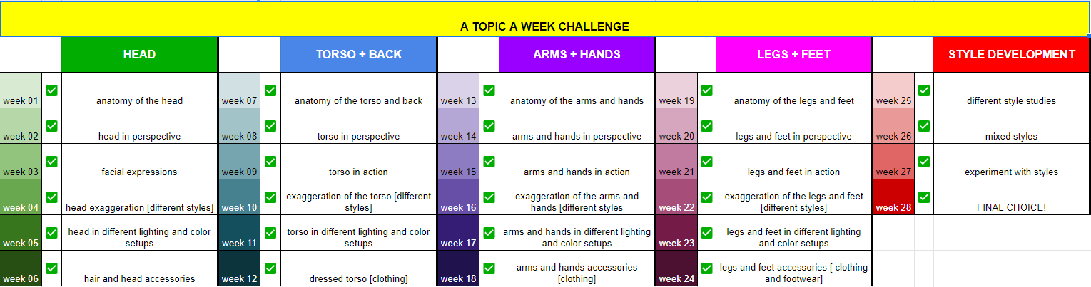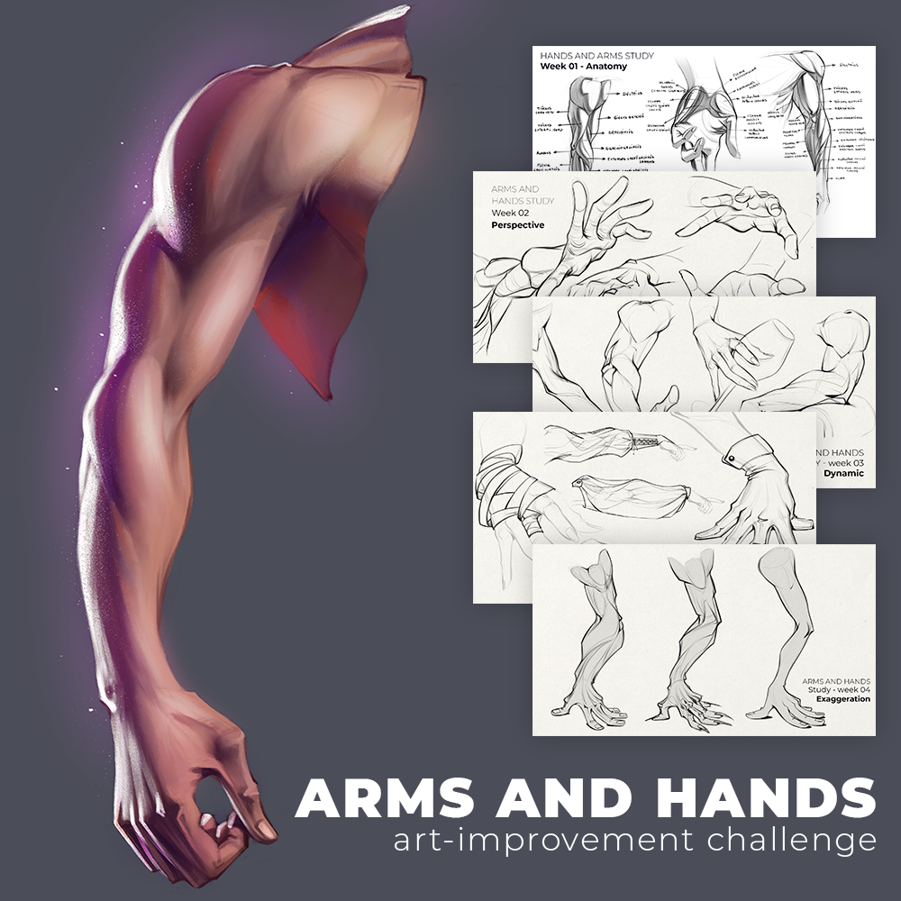 It’s a weekly structured challenge I put together for myself, to push through my struggles and improve my human body drawing skills. I’ve included everything that helped me along the way. All the free online resources I used, weekly assignments, small tips I discovered on the go, and the skills I slowly built up.